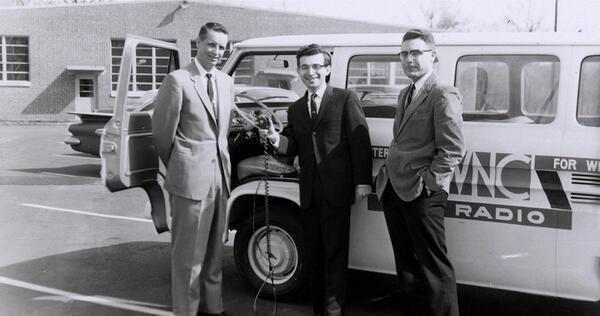 In this photo from 1962, Thomas Simpson, the first President of A-B Tech, is about to be interviewed on WWNC Radio. The mobile broadcasting vans may have changed, but the frequency is still 570 AM.
