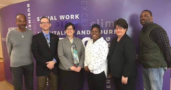 The other photo shows their committee: Dr. Kofi Lomotey, Chair and WCU Faculty; Jonathan Vester; Shelley White; Dr. Brandi Hennant-Crawford, WCU Faculty; Dr. Janice Gilliam, President of Northeast State Community College, and Dr. Lowell Davis, WCU Faculty.