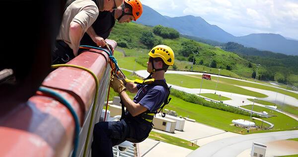 The EMS students in the Rescue Scene Management class practiced their rappelling skills at A-B Tech Woodfin. Using one of the practice towers, they learned about safety, form, and how rappelling will likely be needed at some point in their careers. Students wore face masks until it was time to rappel, so instructors would have no problem understanding them if they needed help.