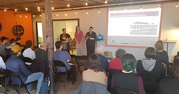 Marlene Frisbee’s Marketing and Retailing students are doing a capstone project to promote the Asheville Film Festival, which takes place on the A-B Tech Asheville Campus on September 16. Her class is working with the festival’s director, Ron Cooper, who also runs the ENC Film Festival at Pitt Community College. The photo is from a presentation the students did to promote the festival at the 1 Million Cups of Coffee downtown. Students presenting were: Nora Steppe, Jennifer Webb, and Farra Lomasney.