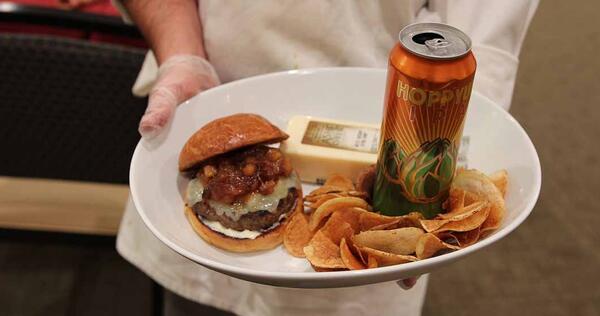 The burger is a Ground Beef Patty, Duke’s Mayo, IPA-infused Apple, and Red Onion Jam, Ashe County White Cheddar Cheese on a Toasted Brioche Bun. Served with house-made chips.