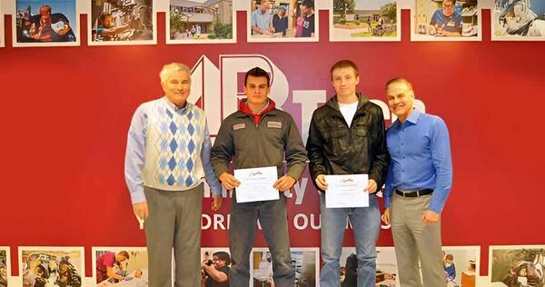 Gentry Heating, Inc. provided two scholarship gifts in honor of Jim Nash, a retired Gentry employee, to students in the HVAC program. Pictured are, from left, Jim Nash, student Veniamin Sydorskyy, student Michael Ponder, and Duane Gentry, Gentry Heating President.